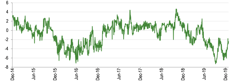 As a result of the global slowdown, rating agencies have already expressed their expectations of default rates returning closer to historical averages in the near term. In the European market, S&P expects the default rate for speculative grade issuers to reach 2.8% by mid-2020. In the US, S&P forecasts the corporate debt default rate to reach 3.4% by mid-2020. Similarly, Fitch forecasts US leveraged loan defaults to rise to 3% in 2020 from the current 1.7% (LTM at September 2019). Still, these levels are visibly below the default rates seen historically during periods of economic stress. We believe that this is at least partially supported by the prevalence of covenant-lite loans (which represented well above 70% of newly issued institutional debt in 2017 and 2018) leading to fewer technical defaults. However, once defaulted, these loans are likely to exhibit lower recoveries, with S&P expecting current cycle senior secured and first lien debt recovery rates below 60% vs over 70% in previous cycles.