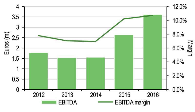 The company moved from a net debt position to a net cash position in 2014 and issued 150,000 shares in H116, raising funds of €5.9m. Net debt at the end of 2016 was made up of gross cash of €11.7m, €2.9m in bank loans (being repaid at €0.84m per annum) and a further €1.5m due in mezzanine financing (due for repayment in February 2019).
