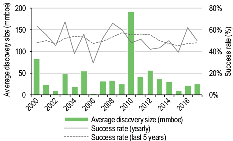 Exhibit 14: NCS technical success rate and average discovery size, 2000–2017