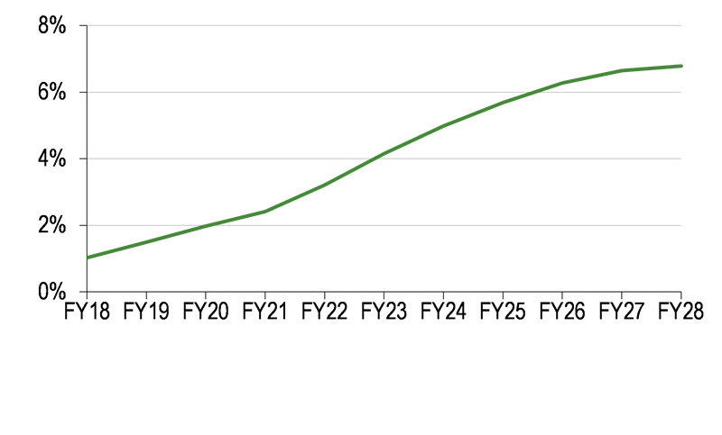 While the UK takes six years (including our current year forecast) to achieve market share of 6%, the current share price implies that mainland Europe takes eight years to reach the same level, in FY26. It may be a reasonable assumption that it takes this longer time, because of the scale of the market and because of the scale of online competition in Europe.