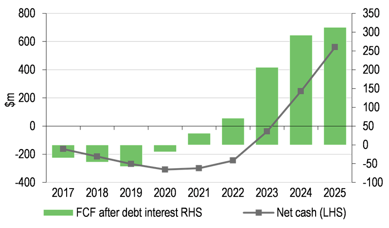 Exhibit 9: Base case free cash flow (post-financing) and net cash evolution