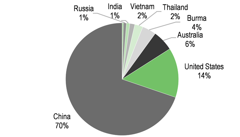 Rare earths are very politically exposed. Rare earth mining and processing has become dominated by China over the past two decades, in part owing to lower prices forcing out western suppliers and, in part, owing to its being one industry where China has a natural resource endowment. China accounted for 70% of rare earth mined production in 2022. However, this was as high as 90% in recent years. Moreover, the next largest producer (the United States at 14%) has been sending its mined rare earth concentrates to China for processing. This is now ending, with the US shifting to domestic rare earth separation and ultimately magnet making (US production is dominated by US-listed MP Materials, which has been striking backward integration partnerships with General Motors). De-globalising rare earth supply chains is a key long-term strategic priority in terms of supplying energy transition materials.