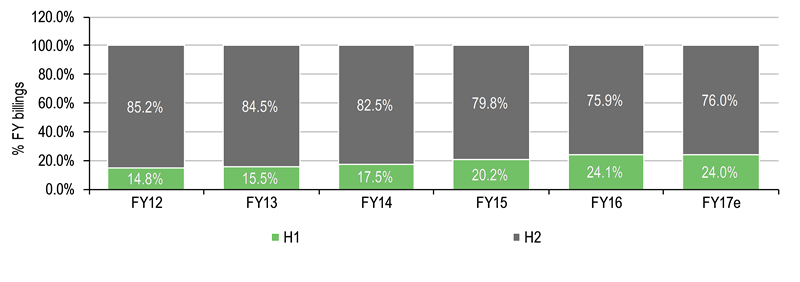 Park’s business is highly seasonal with the majority of its revenues and profits focused on the H2 Christmas period, and the first half of the year traditionally loss making. Continued investment in digital sales, distribution and products has seen the share of total annual sales (defined as billings), generated in H1 increase, from less than 15% in FY12 to 24% (our expectation in FY17), and the H1 pre-tax loss has correspondingly declined from £4.4m to £0.8m over the same period.