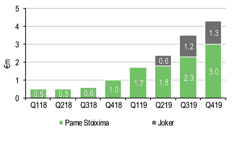 Joker was launched in 1997 and is the best-known brand in the portfolio. In 20 years of operation, Joker has distributed over €1bn to first tier winners. OPAP has also launched Joker online, with an acquisition campaign in Q419 that resulted in revenues of €1.3m in the quarter. See below for more details.