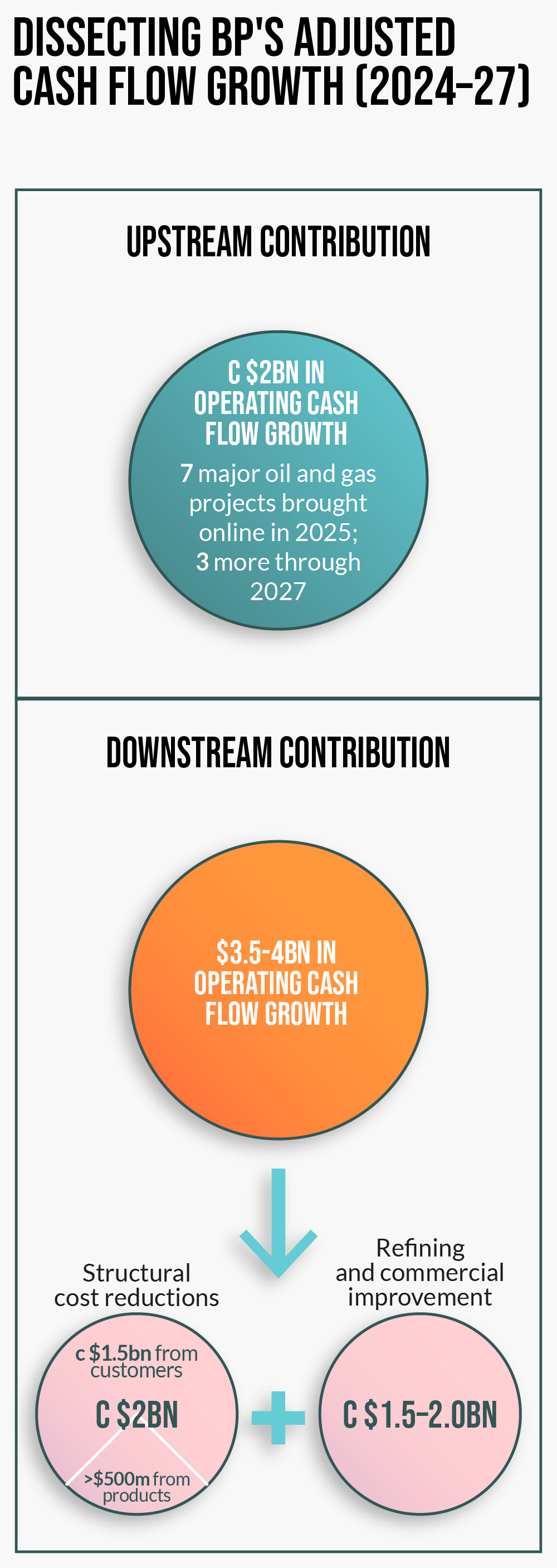 Second, and more significant for near-term growth, is the turnaround in the downstream business. According to bp’s projections, this segment is expected to deliver $3.5–4.0bn in operating cash flow growth by 2027. The company has broken this down into two primary drivers: