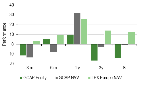 The NCC ratio allows GCAP to decide how much capital it should invest, ie it acts as a kind of ‘volume button’. The ratio is defined as net debt and guarantees issued at the holding level plus total planned investments, announced buybacks and a US$50m contingency/liquidity buffer divided by portfolio value. GCAP aims to conduct meaningful buybacks and investments at an NCC below 15%, tactical buybacks and investment at an NCC between 15% and 40% and pursue a cash preservation strategy when NCC exceeds 40%. The company is currently focused on deleveraging the holding company by bringing down its NCC ratio below/close to 15% by December 2025 (vs 28% at end March 2022). We understand that the above results from GCAP management’s belief that GCAP’s leverage is one of the factors contributing to its wide discount to NAV (see the discount section for more detail). We agree with this given both the incremental funding risk and the increased NAV volatility arising from meaningful leverage at the holding company level.