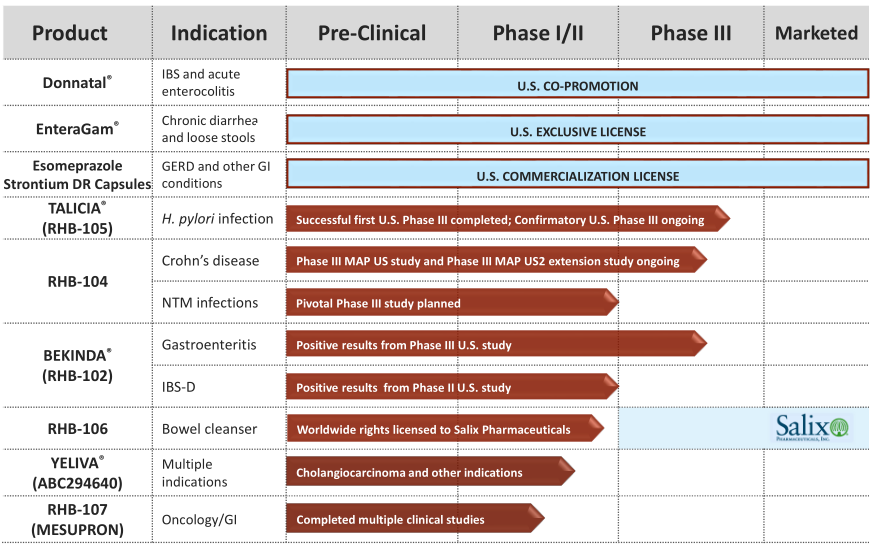 Study design (pending FDA feedback) – n=100; double-blind, placebo-controlled Phase III study in newly diagnosed or recent repeat culture positive non-cavitary MAC disease; 1:1 randomisation RHB-104 vs placebo; six-month treatment for primary efficacy end point with continued follow-up treatment for an additional 12 months