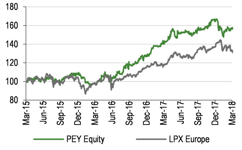 While it invests globally, PEY hedges its currency exposure to help reduce the impact of fluctuating exchange rates (primarily $/€) on performance. Through instruments such as options and forward contracts, the fund reduces its US dollar exposure (from 33% to 13% after hedging at 31 December 2017) and increases its euro exposure (from 62% to 84%), in line with its reporting currency.