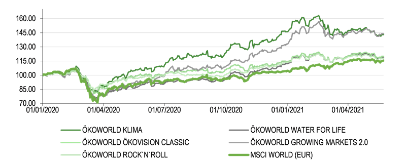The pandemic had only a short-term negative impact on the performance of the funds managed by ÖKOWORLD LUX, as all of them finished 2020 reporting healthy double-digit annual returns and setting new record-high unit price levels. ÖKOWORLD Ökovision Classic, the largest fund in the portfolio (c €2.0bn AUM at end-April 2021) recorded a 14.7% return in 2020 (vs the MSCI World index at 6.3% in euro terms) and a further 7.5% in 2021 ytd to end-April (vs the MSCI World index at 11.6%).