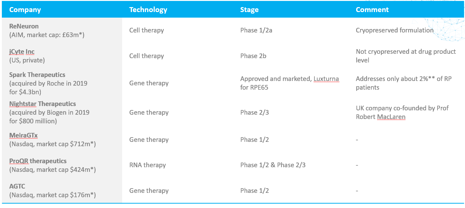 ReNeuron Group is a UK biotech company developing allogeneic cell therapies. Human retinal progenitor cells are the lead Phase I/IIa project for retinitis pigmentosa. There is a strong preclinical technology base in exosomes and cell therapies.