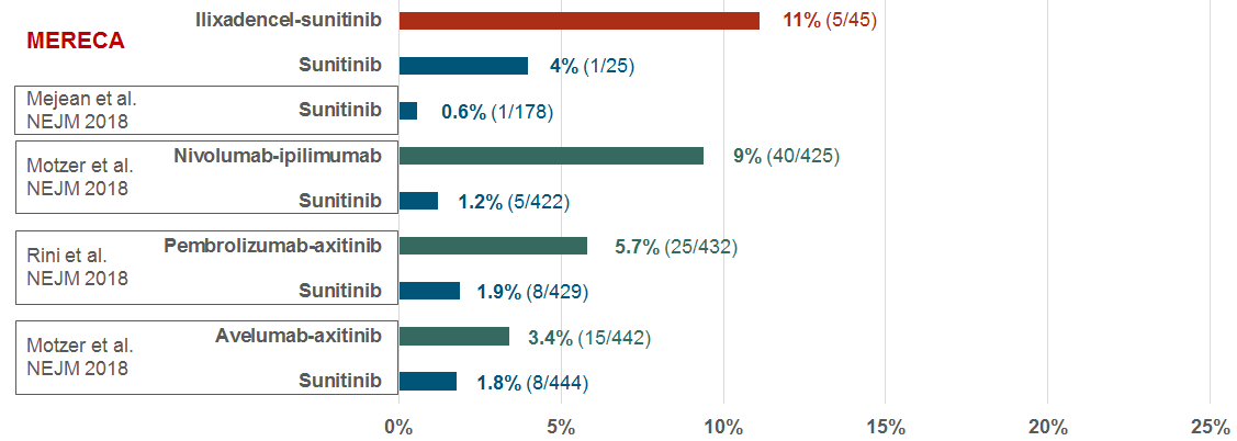 Immunicum released Kaplan-Meier plots, which indicate the 18-month cut-off for survival analysis may be premature. Immunicum plans to conduct the next patient survival check once all patients are followed up for at least 24 months and the updated results are expected in January 2020. In the ilixadencel arm, five of 45 evaluable patients (11%) achieved a complete response, while only one of 25 patients (4%) achieved a complete response in the control arm. For comparison, the complete responses achieved by three novel approved treatments for RCC (all combinations include a checkpoint inhibitor) varied between 3.4% and 9.4%.