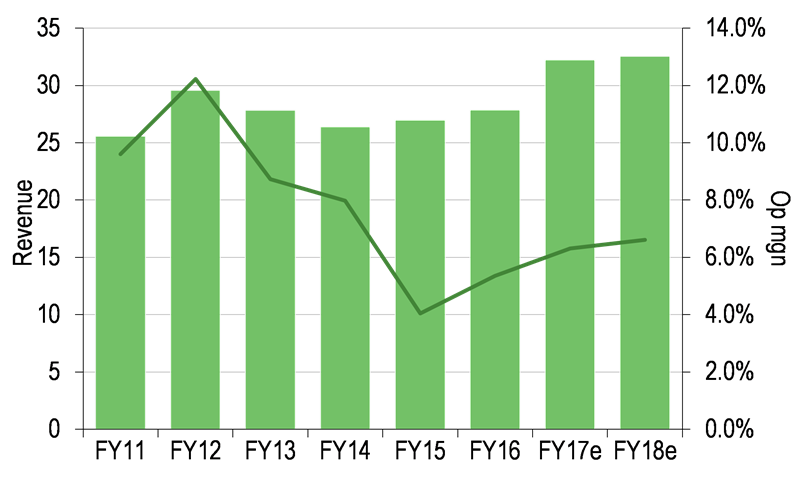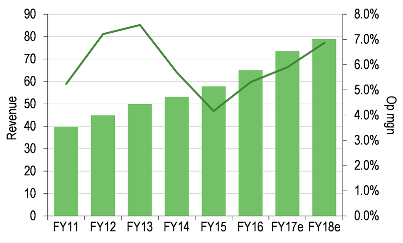 Tight financial management has seen the gearing situation first brought under control then actively managed down and at a notably faster pace than we had anticipated. The result is that the group has strong support from its bankers, with facilities recently renegotiated with HSBC on improved terms. More importantly, the strict discipline on cash management has given the executive team the comparative freedom to be able to make operational decisions (in particular the significant capital investment programme across its key manufacturing facilities) in the interests of building the group’s future rather than simply focusing on paying back the debt. In FY09, the group had gearing of 168%. EBITA was roughly the same level as the interest bill, EBITDA at 2.3x interest and the market was understandably sceptical that the group could pull through in a dull underlying market. Seven years on and net gearing is 25%, with EBITDA 6.0x the interest bill in FY16. The group also has state-of-the-art manufacturing at its key sites, with compliance with onerous customer requirements on environmental factors, which gives a strong competitive advantage.