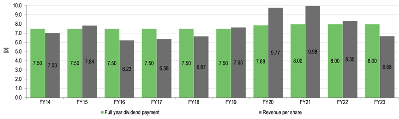 UIL follows a levered strategy using ZDP shares and bank debt. Its £37.5m senior secured multicurrency revolving facility with Bank of Nova Scotia, London branch, was extended in September 2023 to 19 March 2024, reduced to £25m and will be stepped down further prior to the final payment. UIL’s board stated its commitment to reduce the company’s debt and gearing in the FY14 annual report and it has fallen from more than 150% at 30 June 2013 to 80.1% at 31 August 2022, which is well below the board’s 100% maximum target.