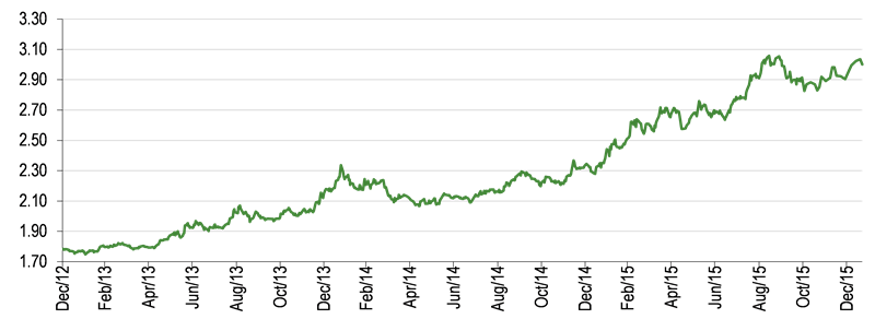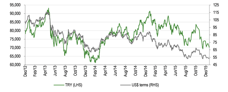 We have lowered our 2016 forecasts for ISY to reflect what we now expect to be more difficult financial markets. On the basis that market conditions remain similar, we expect that in 2016 Is Investment (parent) will earn comparable net profits to those it earned in 2015. We anticipate that there will be reduced losses at Is Investment Trust compared with 2015 on the assumption that Turkish bond yields in 2016 are in line with those at the end of 2015. We also anticipate a slightly lower level of losses at the foreign subsidiaries, with Dubai closure costs having been mainly booked in 2015. However, we continue to expect losses at Is Private Equity and Efes NPL Asset Management to maintain its reduced level of profits, as we do not expect a significant turnaround in their operating environments in 2016. The net result is that we have lowered our 2016 net attributable profit for the group by 22% to TRY49m, although this is a 21% increase on the 2015 outcome. We tentatively forecast 2017 net profits for the group at TRY56.7m, 16% higher than in 2016, with most of the improvement arsing at Is Investment (parent) from increased market activity.