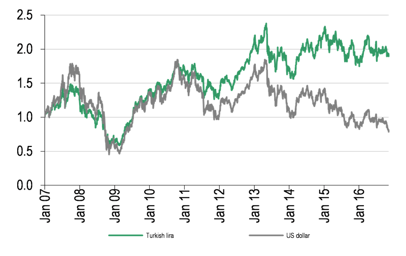It has been a turbulent year for Turkish stocks, in large part due to the political situation in Turkey and its neighbours, with an attempted coup in July and war in Syria and Iraq. Despite these and other factors, the BIST 100 index has been remarkably resilient, up 7.9% in Turkish lira terms over the year to date and having recovered since the coup attempt to the levels of May and June. In part this has been due to the cessation of Russian sanctions in June, which had been imposed after a Russian military plane was shot down by Turkish forces in November 2015.