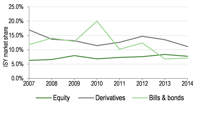 Q315 results for ISY were a continuation of the performance achieved earlier in the year, with the investment bank performing relatively well in its core activities, but a number of one-off negatives, especially in the subsidiaries, resulting in group net profit falling by 30% y-o-y, as shown in Exhibit 9 below.