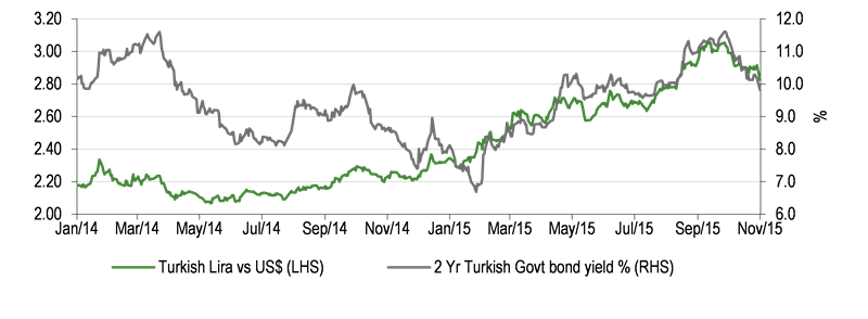 Turkish bond yields have risen for most of 2015 and the Turkish lira has depreciated against the US$ over concerns about Turkey’s economy and geopolitical and local political uncertainties. However, even before the outcome of the Turkish elections was announced in November, there was a recovery the lira and a fall in Turkish bond yields, as investors increased their risk appetite for Turkish assets.