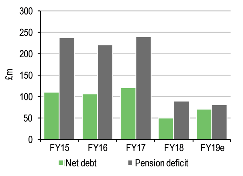 The balance sheet has been significantly strengthened. Net debt of £111.0m at the end of FY15 had fallen to £50m at FY18 and we estimate will end FY19 at around £71m. The pension accounting deficit had also reduced to at £79.3m at the end of H119. We expect the current triennial actuarial review should also reflect at least some of the improvement. This could have a positive effect on cash contributions, which are currently slated to rise to £23m annually through to 2028.