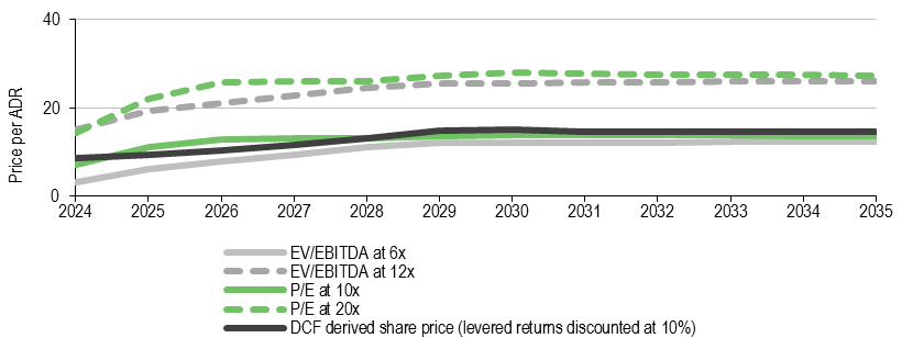 Financing risks: LNGL needs to secure the funding for the development of the projects. For the 8mtpa Magnolia project, this is US$4.4bn (gross excluding other costs, $5bn including other costs). Of this, we assume 30% should be funded by equity (from Stonepeak), with the rest funded through debt. Without this funding, the Magnolia project’s (and hence LNGL’s) value could be uneconomic or severely compromised. The Magnolia project’s expansion towards 8mtpa means that more equity financing will be required. If it does not come from Stonepeak, financing will have to be found elsewhere. However, the involvement of BNP Paribas as debt co-ordinator encourages us regarding the potential funding at this stage.