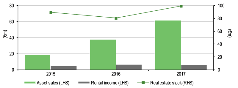 The Noratis model of upgrading and selling assets allows financial periods to be regarded as either acquisition or disposal years. Exhibit 1 shows that 2017, unlike its predecessor, was clearly an acquisition year despite a step-change in sales proceeds. Year-end stock was up by c 20%, both in terms of units (1,194 vs 1,008 in 2017) and book value (€99m against €80m), which lays a strong base. A highlight was the purchase of 355 units at Ratzeburg/Mölln in H2. In turn, the two blocks at Dormagen, acquired in late 2015 and sold separately in 2017, accounted for the bulk of disposals (530 of 587 units sold). Rental income was broadly stable and in line with the company’s focus on acquiring largely occupied residential assets, which yield immediate income.