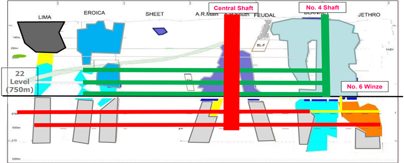 AR South decline below 750m (22 Level): a conveyor belt was commissioned, the extraction haulage on 780m level was completed and work of the 785m extraction haulage level continues (these are represented as the two horizontal, red-shaded lines below 750m on Exhibit 1 above).