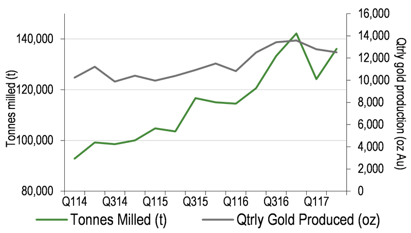 This constraint on material handling around the Central Shaft development led the company to initiate a number of work programmes in an attempt to raise tonnes and thereby maintain gold production targets. For 2017, 60koz of gold were to be produced. However, as mentioned above, constraints on the 22 Level forced the company to revise this gold production target down to a range of 52-57koz. We have revised our model to reflect production of 54koz of gold, with 14.2koz produced in each of Q317 and Q417.