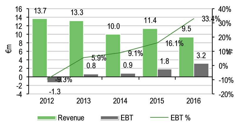 Operating profit (EBIT) continued to increase, reaching €800k (FY15: €612k) as a result of a more favourable balance of other income and expenses, including a gain of €957k from the sale of shares in a real estate fund and a €228k gain on the deconsolidation of the energy companies. The increase in staff costs reflects higher performance related remuneration, with average staff numbers down slightly from 47 to 45.