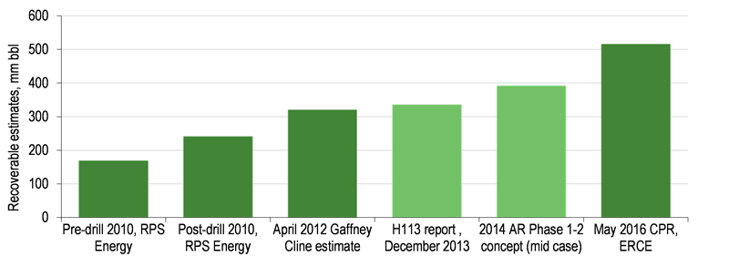 Source: Rockhopper Exploration, Edison Investment Research. Note: Dark green bars represent independent audit estimates, light green provided by company and/or Premier Oil.