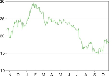 Exhibit 1: Silver Wheaton share price, year to date (US dollars)
