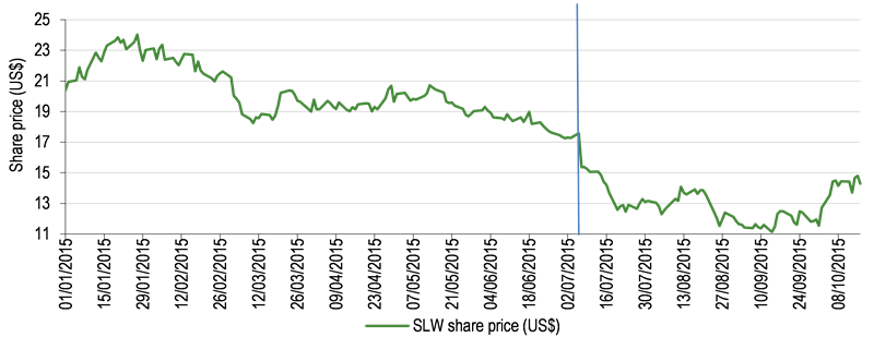 Silver Wheaton’s shares have fallen by US$3.98 since its receipt of the CRA’s original proposal letter on 6 July (the vertical line in Exhibit 1), although it is notable that the interim timespan has also coincided with a renewed period of weak precious metals prices.