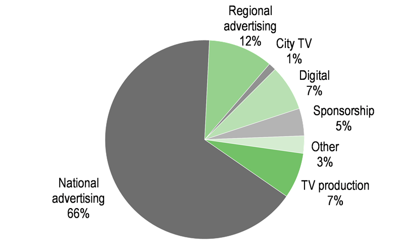 Contrasting with the ongoing declines in newspaper circulations, TV advertising has been relatively unscathed in the move to online and, over the last few years, ITV’s audience and advertising has also been fairly stable (Exhibits 5 and 6). However, the way consumers access TV is evolving rapidly. According to Ofcom, 60% of adults in Scotland have a smartphone and 50% a tablet. Half of Scots now use catch-up services and 21% use standalone OTT services (up 12 percentage points on the year before). For younger demographics, the change in viewing habits is even more marked, with only half of TV viewing done live via broadcast.