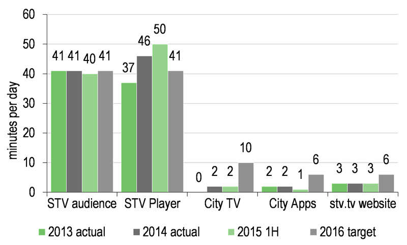 Localisation is a key part of STV’s strategy to engage the consumer and compete with other media. STV has been awarded five 12-year licences to launch City TV channels in Scotland. Glasgow TV was launched in July 2014, Edinburgh TV in January 2015 and STV plans to launch Aberdeen, Ayr and Dundee in 2016. Together these channels cover 80% of Scotland’s population. The channels are produced in association with local universities, which gives a unique flavour and reach into the local community. STV has developed a low-cost TV package for local advertisers where the cost of producing an advert is bundled into the advertising sales agreement. In doing so, it is enabling many local SMEs to advertise on TV for the first time. The channels are also feeding the wider STV network with talent, content and cross-marketing opportunities; for instance, after the launch of STV Glasgow, use of its City App increased by 80%.