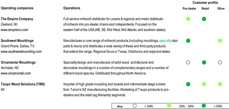 Around mid-year, Tenon announced that an operational review of the company’s North American footprint was underway, targeting growth initiatives and service efficiencies. Management change was announced in May; new senior management at the two largest subsidiaries Empire and Southwest Mouldings under a new president, North America – all filled by internal promotions – indicates that strategic implementation is underway. We believe that deeper penetration of both pro-dealer and retailer segments with a greater degree of supply chain integration are the key elements of this strategy. Additional pro-dealer regions, new product lines into both pro-dealer and retail segments and a planned consolidation of two warehouses into one in Dallas during H216 are all examples of actions that should begin to bear fruit in FY16, but more so in future periods.