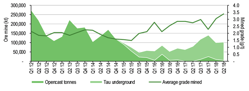First development ore was mined from Tau Underground in May 2014 and stoping began in Q315. The chart below shows the impact that the ramp-up of Tau underground has had on average mined grades at Mupane. With mining at the small Tekwane pit completed n H118, Mupane is now mining at Tau underground only, supplemented by processing of historic stockpiles.