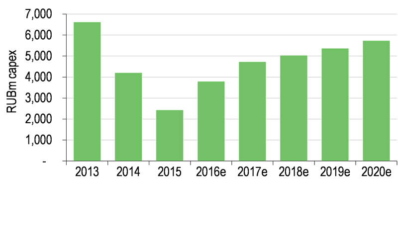 At Q116, management highlighted that in April and May the “Russian rail container market demonstrated a positive year-on-year dynamics (sic) for the first time following six consecutive quarters of year-on-year decline”. RZD data confirm this by showing that rail container transportation volumes increased year-on-year in April by 10.5%. While this would seem consistent with Russian economic leverage to the oil price, which has increased in recent months, we are more cautious and need to see sustained evidence of a recovery before updating our short-term forecasts. We do factor in volume growth this year and in coming years, but we do not forecast a return to the previous EBITDA (TRC definition) peak until FY19.