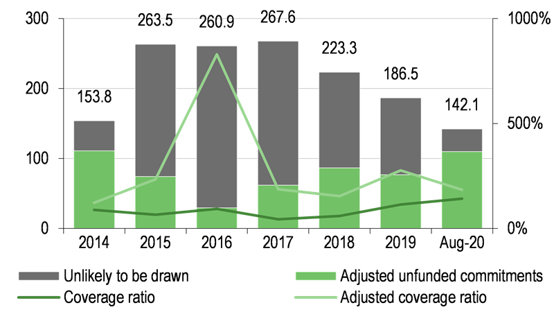 An additional potential mitigating factor is the high proportion of companies with covenant lite debt (67% of NBPE’s top 50 investments at end-August 2020). This is in line with the broader market trend as nearly 80% of outstanding US leverage loans at end-2019 were covenant lite. Loose covenants are beneficial for equity investors, because they constitute more flexible funding terms limiting the risk of a COVID-19-induced credit crunch and providing more room for restructuring efforts if necessary, while they can translate into lower debt recovery rates on default.