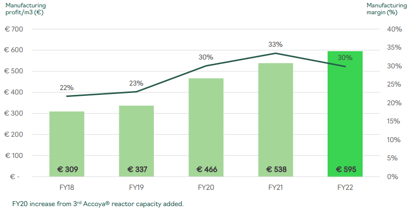 Accsys’s FY22 revenues (ending 31 March) increased 21% y-o-y to €121m, largely driven by price increases, while volumes were down slightly due to capacity restraints and a temporary plant stop related to the construction of the fourth reactor in Arnhem. Several price increases offset higher input costs in FY22, resulting in an increase in normalised EBITDA of 3% y-o-y. For FY23, Accsys expects an acceleration in revenue growth from H223, driven by new capacity coming on stream, and EBITDA to nearly double from the level of €10.4m in FY22.
