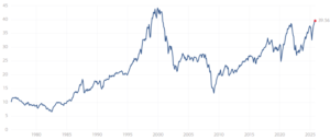 The CAPE ratio tells a sobering story. At 39.56x, we are in rarefied territory; only the dot-com bubble saw higher levels. While not yet at the 2000 peak of 44x, we are far above the historical average of 17x. This suggests investors are paying premium prices for future earnings that may not materialise.