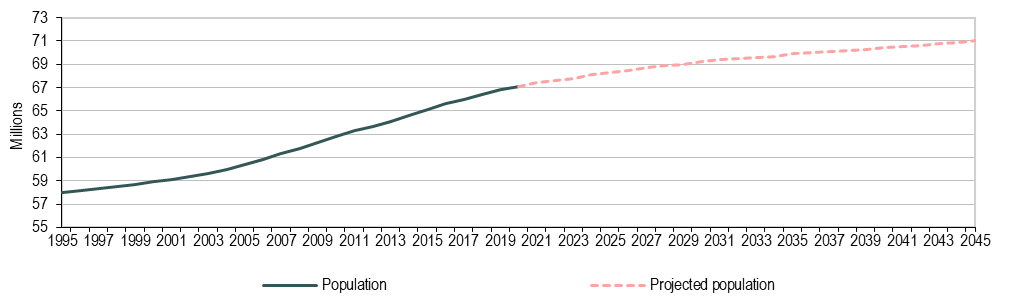 Source: ONS. Note: Estimates from mid-1995 to mid-2020 and projections to mid-2045.