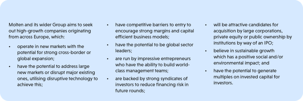 Disciplined portfolio management remains a key differentiator and is seen across Molten’s investment strategy and the investment process.