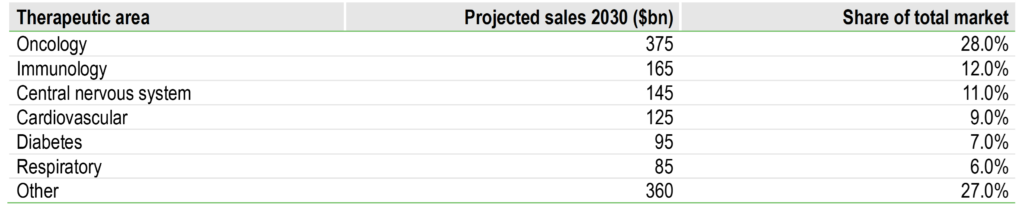 Oncology remains the largest and most innovation-intensive therapeutic area in pharma, reflecting a combination of large addressable patient populations, persistent unmet need and the high economic value of clinically meaningful survival improvements. According to Evaluate Pharma, oncology accounted for 39% of global pharmaceutical R&D spend in 2023, with projected sales of $375bn by 2030, more than twice that of the next largest therapeutic area, immunology, at $165bn (Exhibit 1).