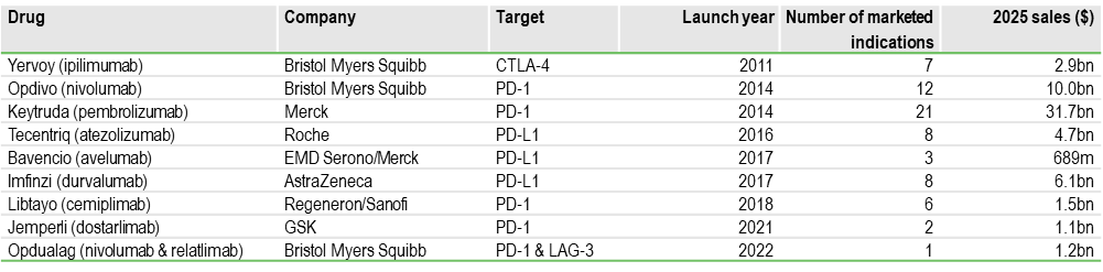 With PD-1/CTLA-4 franchises such as Merck’s Keytruda (>$30bn in sales in 2025) reaching maturity, incremental value is shifting to next-generation checkpoints that can address adaptive resistance, extend duration of response, expand responder populations and support lifecycle management. Bristol Myers Squibb’s (BMS’s) Opdualag (LAG-3/PD-1 combination) provides the first commercial proof that dual-checkpoint strategies can extend durability and defend PD-1 backbones. We expect assets showing additive efficacy with PD-1/CTLA-4s and favourable safety are most likely to secure partnering and premium valuations.