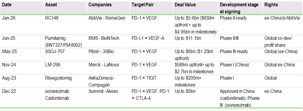More recently business development activity in ICI bispecifics has increasingly converged on the PD-(L)1 × VEGF axis, which has emerged as one of the most competitive post-PD-1 backbone strategies. VEGF (vascular endothelial growth factor) is a key signalling protein that tumours use to stimulate the formation of new blood vessels (angiogenesis). VEGF-targeted therapies disrupt this process, effectively starving the tumour and normalising its abnormal vasculature. By simultaneously blocking immune checkpoints and normalising tumour vasculature, these agents may help address two of the key limitations of first-generation PD-1 therapy: poor T-cell infiltration and an immunosuppressive microenvironment. A series of large transactions, including multi-billion-dollar collaborations, the largest being the $11.1bn deal between BMS and BioNTech (for pumitamig) in June 2025, highlights big pharma’s urgency to secure next-generation platforms that combine immune activation with TME normalisation. Exhibit 4 lists the major ICI bispecific licensing deals since 2022, the largest volume and value of which have been in PD-1 x VEGF bispecifics.