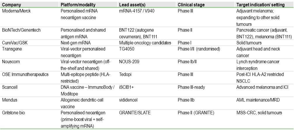 Neoantigen targeting – moving beyond shared self-antigens: Next-generation cancer vaccines prioritise tumour-specific neoantigens rather than shared TAAs, avoiding central immune tolerance and enabling high-avidity cytotoxic T-cell responses. This shift materially improves the probability of meaningful tumour control, as neoantigens are recognised as non-self and can drive polyclonal immune activation through multi-epitope designs. Clinical validation is emerging across multiple platforms. Moderna/Merck’s V940 has demonstrated a significant reduction in melanoma recurrence in the adjuvant setting in a randomised Phase IIb trial, while BioNTech/Genentech’s autogene cevumeran has generated strong neoantigen-specific T-cell responses in pancreatic cancer. Viral and epitope-based approaches from Nouscom (NOUS-PEV), OSE Immunotherapeutics (Tedopi) and Transgene (TG4050) further underscore the central importance of antigen selection, alongside optimised delivery technologies, in driving immunogenicity and clinical activity.