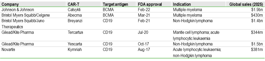 CAR-T therapies (such as Gilead’s Yescarta and Novartis’s Kymriah) deliver potentially curative outcomes in select haematological cancers, but uptake remains constrained by limited solid-tumour efficacy, manufacturing complexity, high cost and toxicities. Next-wave strategies, including allogeneic platforms, bi-specific/multi-targeting constructs programmes and CRS-mitigation approaches, promise to reduce infrastructure intensity and enable earlier-line use, and will determine CAR-T’s evolution from niche therapy to a broader commercial modality.